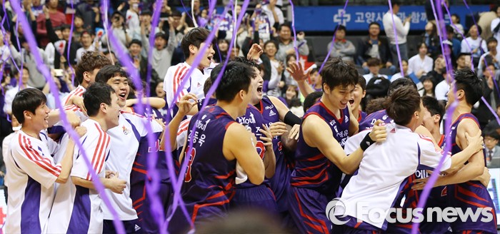 (고양=포커스뉴스) 29일 고양체육관에서 열린 2015-2016 프로농구 챔피언결정전 6차전을 승리하며 우승한 오리온 선수들이 경기 종료와 동시에 함께 뒤엉키며 환호하고 있다.