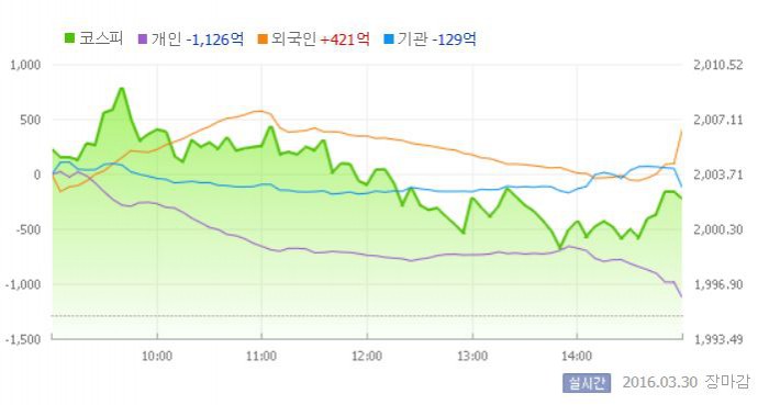 30일 코스피지수는 전일 대비 0.36%(7.23포인트) 오른 2002.14에 장을 마쳤다. 코스닥지수는 전날 보다 0.67%(4.63포인트) 상승한 691.13에 마감했다.