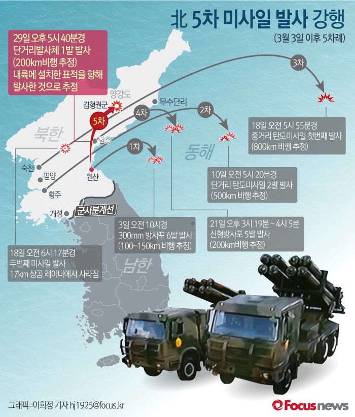 (서울=포커스뉴스) 합동참모본부는 29일 오후 5시 40분 쯤 북한이 원산 일대에서 동북방으로 불상 단거리 발사체 1발을 발사했고, 이 발사체의 비행거리는 약 200km 정도 인 것으로 파악된다고 밝혔다. 이 발사체는 300mm 방사포인 것으로 추정되며, 북한 내륙에 떨어진 것으로 전해진다.