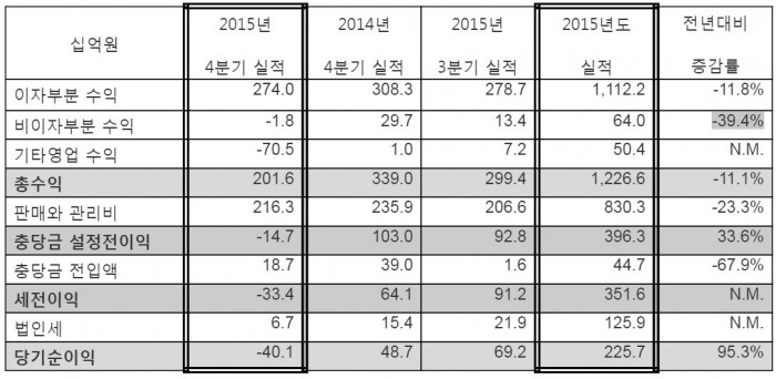 2015년 비이자수익은 전년 대비 39.4%감소한 640억원이며, 4분기엔 18억원 줄어 들었다.