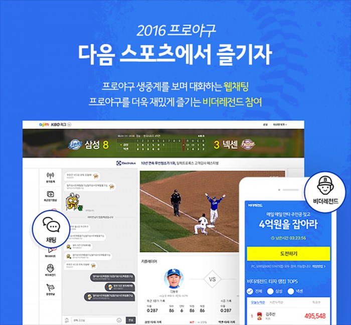 카카오는 2016년 프로야구 시즌 전경기를 다음 스포츠의 야구 중계 플랫폼인 KBO리그 게임센터(sports.media.daum.net)를 비롯해 모바일 다음앱, 다음tv팟, 카카오TV, 카카오톡 채널탭 등 다양한 플랫폼에서 생중계한다. 특히 이번 시즌부터 KBO리그 게임센터에서 생중계되는 경기를 보며 대화를 나눌 수 있는 웹채팅을 적용해 네티즌 팬들이 PC나 스마트폰에서 실시간으로 소통하며 응원하는 즐거움을 만끽할 수 있게 했다.