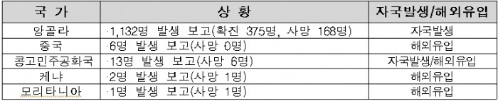 31일 질본에 따르면 앙골라에서 올해 3월28일 기준으로 수도 루안다를 포함해 12개주에서 확진환자 375명(사망 168명)이 발생했다. 올해 1월 이후 환자발생이 증가하면서 유행이 지속되고 있고, 특히 수도 루안다에서 다수(확진 281명, 사망 129명)의 환자가 발생하고 있다.