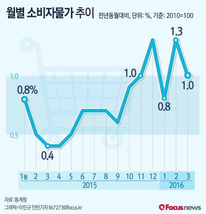 (서울=포커스뉴스) 1일 통계청은 3월 소비자물가가 전년 동월 대비 1.0% 상승했다고 1일 밝혔다. 전년 동월 대비 소비자물가 상승률은 2013년 10월 0.9%를 기록한 이후 13개월 연속 1%대에 머물다가 2014년 12월 0.8%로 떨어진 뒤 0%대 상승률에 그쳤으나 2015년 11월 1%대로 올라섰다. 올해 1월 0.8%로 다시 0%대로 떨어졌지만 2월 1%대에 복귀했다.