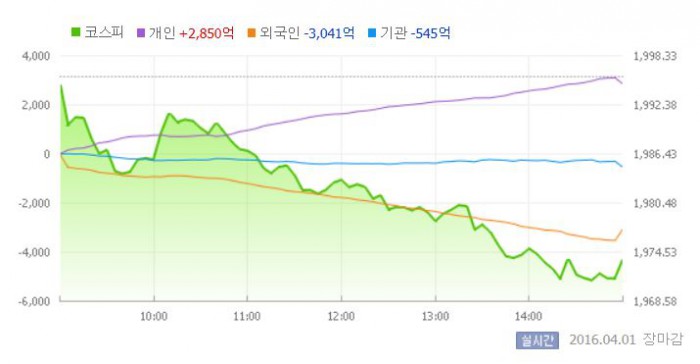 이날 코스피는 1990선에서 장을 시작한 뒤 외국인과 기관의 '팔자'에 낙폭을 확대했다. 오후 들어서는 1% 이상 빠지며 1970선 초반까지 밀려났다.