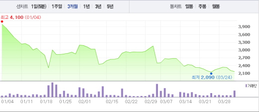 장 중 오전에는 10% 이상의 상승폭을 기록하며 반등에 성공하는 듯 했지만 이후 주가가 빠지면서 하락 마감했다. 지난 2월2일 자구계획을 발표할 당시 주가(3180원)과 비교한다면 31.7% 하락한 수치다.