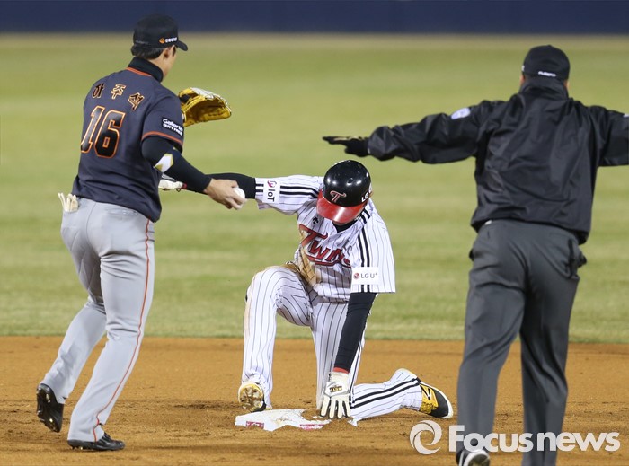 (서울=포커스뉴스) 1일 서울 잠실구장에서 열린 2016프로야구 개막전 한화-LG 경기에서 1회말 1사 1루에서 LG 1루주자 임훈이 박용택 타석때 2루 도루에 성공하고 있다.