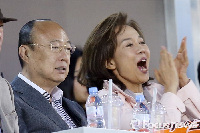 (서울=포커스뉴스) 1일 김승연 한화그룹 회장이 부인 서영민 여사와 함께 서울 잠실구장에서 열린 2016프로야구 개막전 한화-LG 경기를 관전하고 있다.