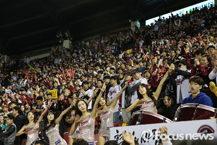 (서울=포커스뉴스) 1일 2016 프로야구 개막전 한화-LG 경기가 열린 서울 잠실구장엔 평일임에도 불구하고 팬들이 구장을 가득 메우고 치어리더들은 그 열기를 북돋우고 있다.