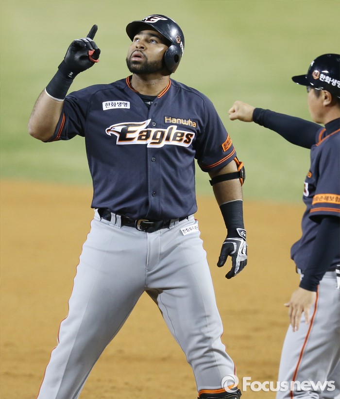(서울=포커스뉴스) 1일 서울 잠실구장에서 열린 2016프로야구 개막전 한화-LG 경기5회초 1사 2루에서 한화 로사리오가 좌익수앞 안타를 치고 1루에서 세리머니를하고 있다.