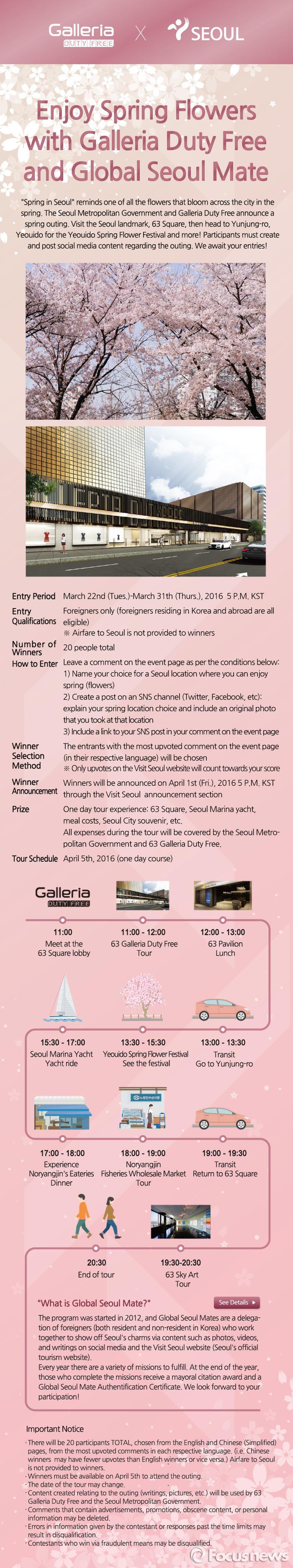 관광투어 코스는 63스퀘어 탐방, 여의도 봄꽃축제, 서울마리나 요트 탑승, 노량진 수신시장 체험, 63스퀘어 스카이 아트 전망대 관람으로 구성된다.