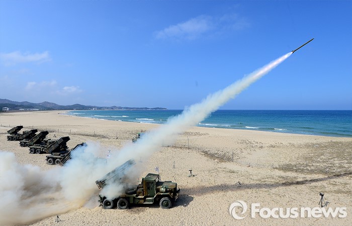 (고성=포커스뉴스) 4일 오후 강원도 고성 송지호해변에서 열린 '2016년 전반기 해상사격 훈련'에서 육군 8군단 포병대대 소속 130mm 다련장 구룡이 로켓탄을 발사하고 있다.