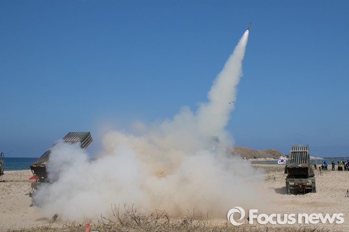 (고성=포커스뉴스) 4일 오후 강원도 고성 송지호해변에서 열린 '2016년 전반기 해상사격 훈련'에서 육군 8군단 포병대대 소속 130mm 다련장 구룡이 로켓탄을 발사하고 있다.
