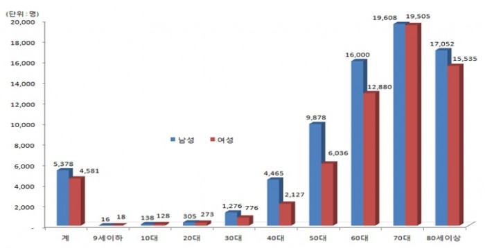 여성도 70대(1만9505명)가 가장 많았고 80세이상(1만5535명), 60대(1만2880명) 순으로 나타났다.