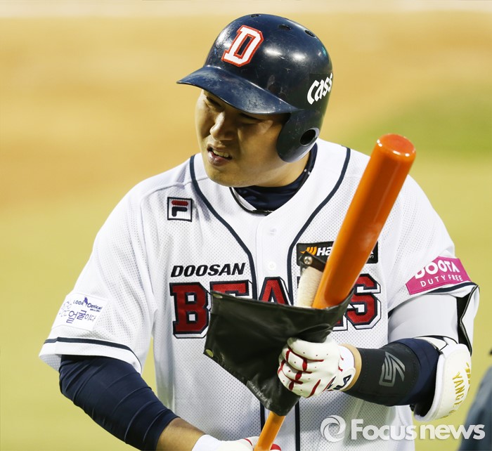 (서울=포커스뉴스) 5일 서울 잠실구장에서 열린 2016프로야구 NC-두산 경기 2회말 두산 양의지가 배트에 송진을 묻히고 있다.