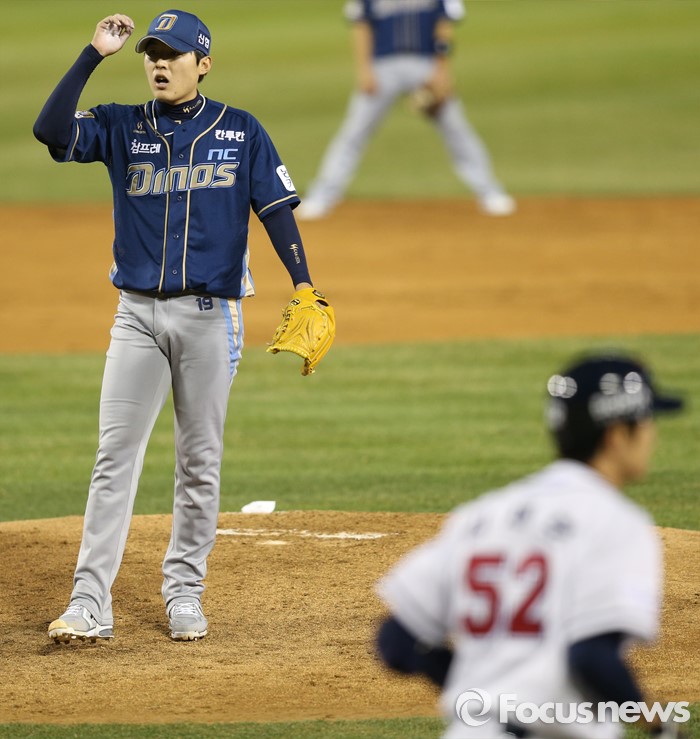 (서울=포커스뉴스) 5일 서울 잠실구장에서 열린 2016프로야구 NC-두산 경기 2회말 2사 만루에서 NC 투수 이태양이 두산 김재호를 밀어내기 포볼로 내보내고 아쉬워하고 있다.
