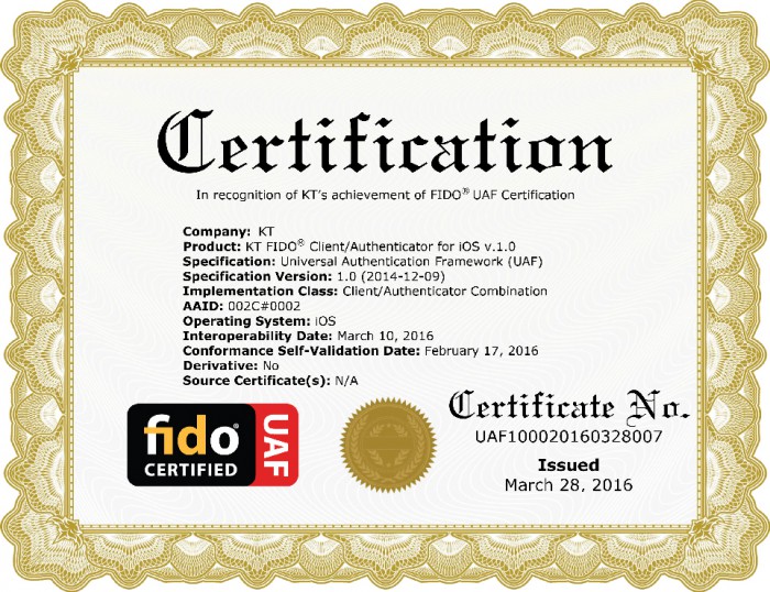 KT는 지난 3월에 FIDO 얼라이언스 주최로 열린 상호운용성 테스트에 참여해 서버(Server), 클라이언트(iOS와 안드로이드), 인증장치 전 분야에서 FIDO 표준규격에 대해 적합성을 검증 받고 인증을 획득했다.