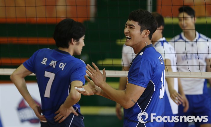 (서울=포커스뉴스) 6일 오후 서울 강서구 KBS스포츠월드에서 열린 예능프로그램 '우리동네 예체능' 촬영현장 공개 행사에 참여한 배우 조동혁(오른쪽)이 환한 미소를 짓고 있다.
