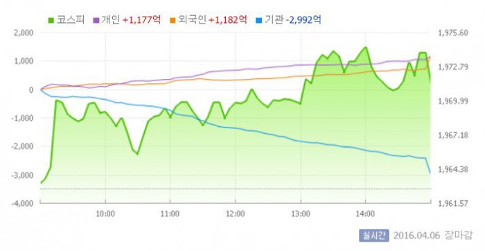 이날 코스피는 전일 대비 0.02% 오른 1963.17로 장을 시작했다. 이후 지수는 1960선 초반에서 등락을 반복했다. 그러나 개인과 외국인의 순매수 규모가 커지자 상승폭을 확대, 1970선에 안착했다.