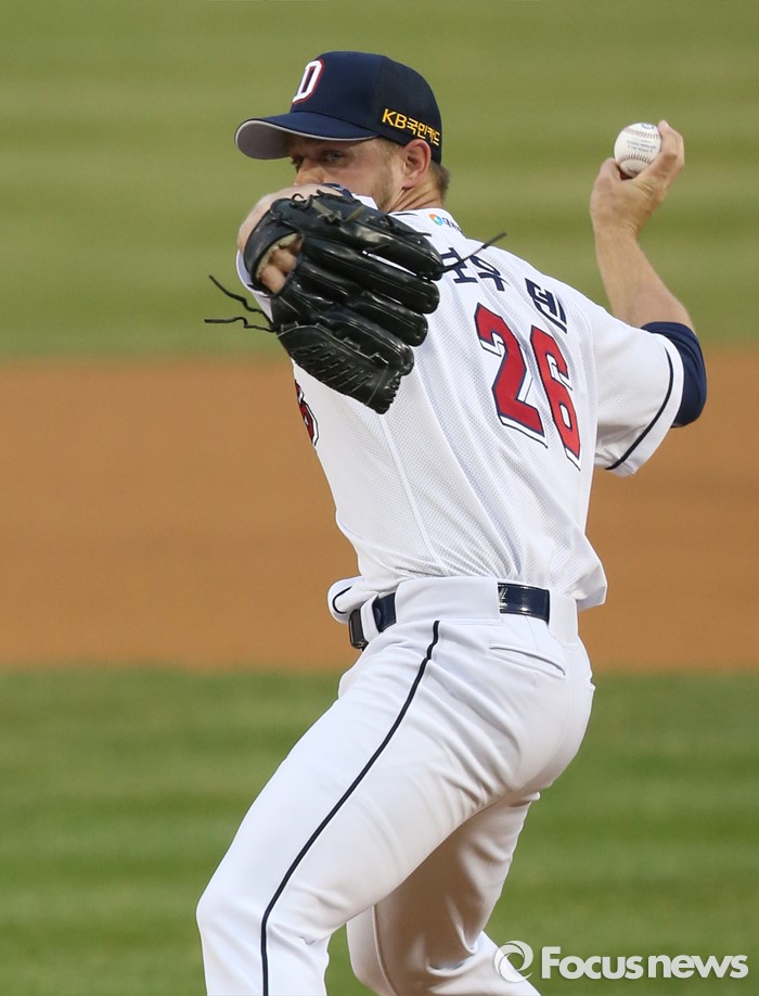 (서울=포커스뉴스) 6일 서울 잠실구장에서 열린 2016 프로야구 NC-두산 경기에서 1회초 두산 선발투수 보우덴이 투구하고 있다.