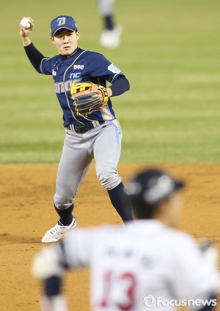 (서울=포커스뉴스) 6일 서울 잠실구장에서 열린 2016 프로야구 NC-두산 경기 2회말 2사 1,2루에서 NC 2루수 박민우가 두산 허경민의 타구를 잡아 1루로 송구하고 있다.