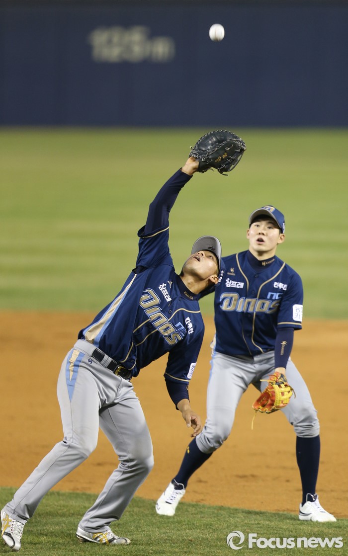 (서울=포커스뉴스) 6일 서울 잠실구장에서 열린 2016 프로야구 NC-두산 경기 2회말 무사 1,3루에서 NC 1루수 조영훈이 두산 최주환의 내야 뜬공을 잡고 있다. 뒤는 2루수 박민우.