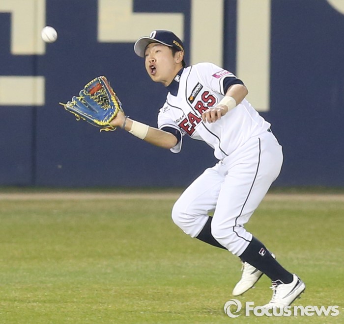 (서울=포커스뉴스) 6일 서울 잠실구장에서 열린 2016 프로야구 NC-두산 경기 2회초 2사후 두산 중견수 정수빈이 NC 이종욱의 좌중간 타구를 전력질주하며 잡아내고 있다.