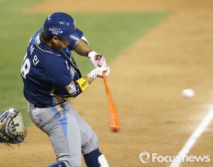 (서울=포커스뉴스) 6일 서울 잠실구장에서 열린 2016 프로야구 NC-두산 경기 5회초 NC 박석민이 우중간 안타를 날리고 있다.