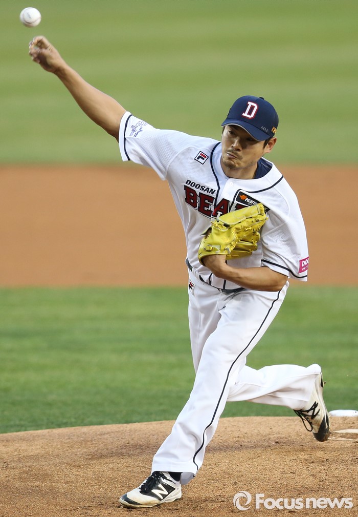 (서울=포커스뉴스) 7일 서울 잠실구장에서 열린 2016 프로야구 NC-두산 경기에서 1회초 두산 선발투수 노경은이 투구하고 있다.