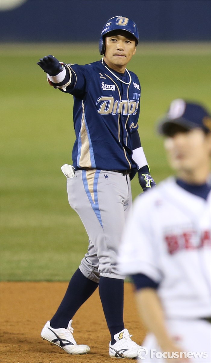 (서울=포커스뉴스) 7일 서울 잠실구장에서 열린 2016 프로야구 NC-두산 경기 3회 1사 루에서 NC 이종욱이 우익수 오른쪽으로 빠지는 2타점 2루타를 치고 2루에서 덕아웃을 향해 세리머니를 하고 있다.