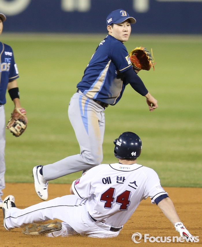 (서울=포커스뉴스) 7일 서울 잠실구장에서 열린 2016 프로야구 NC-두산 경기 5회말 1사 1루에서 두산 양의지의 유격수앞 땅볼때 1루주자 에반스가 2루에서 포스아웃되고 있다. NC 2루수 박민우가 1루로 송구해 병살 성공.