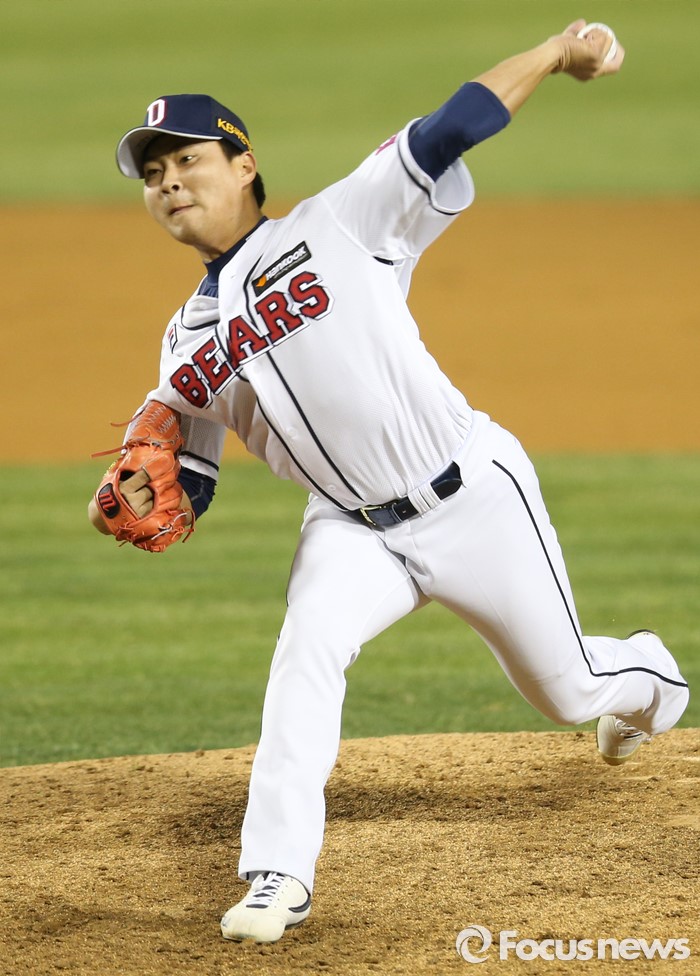 (서울=포커스뉴스) 7일 서울 잠실구장에서 열린 2016 프로야구 NC-두산 경기에서 7회 마운드에 오른 두산 투수 이현호가 NC 이종욱을 상대로 투구하고 있다.