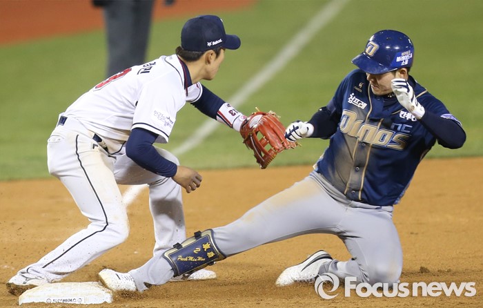 (서울=포커스뉴스) 7일 서울 잠실구장에서 열린 2016 프로야구 NC-두산 경기 5회초 2사 1,2루에서 NC 박민우가 2타점 좌중간 3루타를 치고 3루에서 슬라이딩하며 세이프되고 있다.
