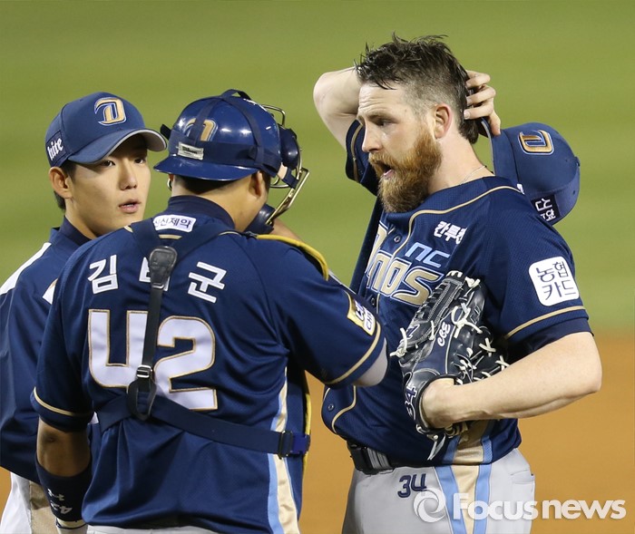 (서울=포커스뉴스) 7일 서울 잠실구장에서 열린 2016 프로야구 NC-두산 경기 4회말 2사 2,3루에서 NC 포수 김태군이 투수 해커와 사인에 대해 얘기하고 있다.