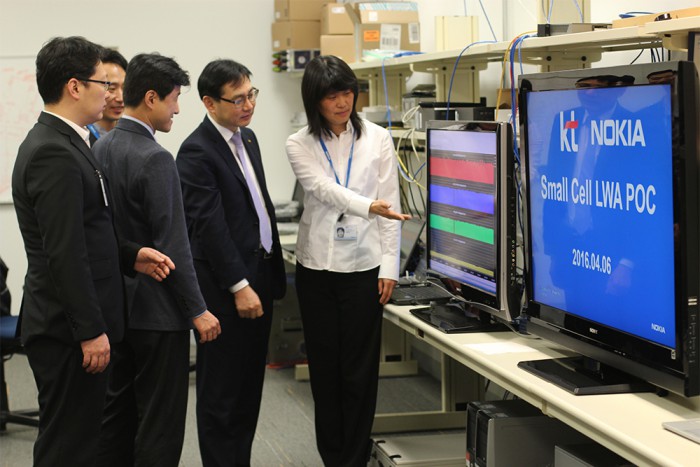 (서울=포커스뉴스) KT는 노키아와 차세대 LTE 기술로 주목 받는 LWA(LTE-WiFi Aggregation, LTE-WiFi 병합전송) 기술 기반의 스몰셀(초소형 기지국) 시연에 8일 성공했다. LWA란 LTE 주파수와 와이파이 주파수를 기지국에서 병합해 전송하는 기술을 말한다.