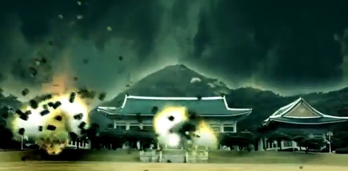 또한 북한의 대외선전용 매체인 '조선의 오늘'은 4일 유투브에 '최후통첩에 불응한다면'이라는 제목의 1분 28초 영상물을 게재하기도 했다. 이 영상물은 청와대와 정부종합청사를 비롯해 서울의 주요 기관을 로켓포로 공격하는 조악한 장면을 담고있다.정부는 8일 북한 조국평화통일위원회의 박근혜 대통령 막말 비방에 대해 강력히 경고했다. 사진은 북한이 5일 유투브에 공개한 청와대와 정부종합청사를 비롯해 서울의 주요 기관을 공격하는 영상물의 한 장면. 2016.04.05. <사진출처=유튜브>