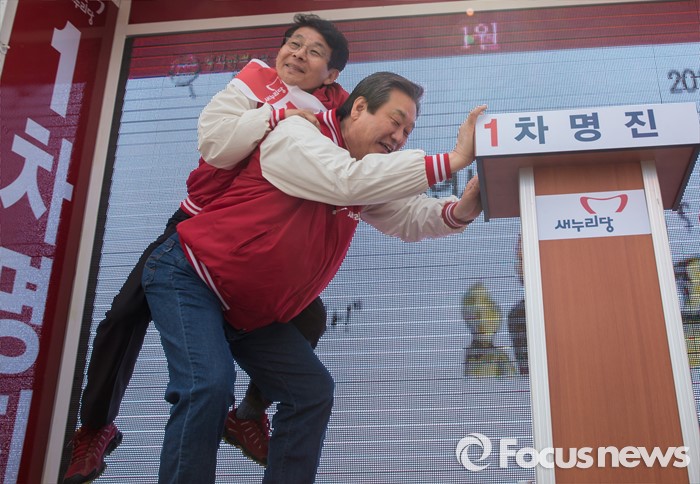 (부천=포커스뉴스) 8일 오전 경기 부천시 역곡역 인근에서 차명진 새누리당 부천소사구 후보 지원유세에서 나선 김무성 대표가 차 후보를 업어주고 있다.