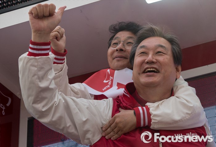 (부천=포커스뉴스) 8일 오전 경기 부천시 역곡역 인근에서 차명진 새누리당 부천소사구 후보 지원유세에서 나선 김무성 대표가 차 후보를 업어주고 있다.
