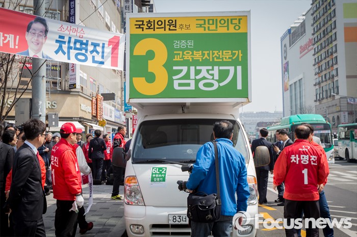 (부천=포커스뉴스) 8일 오전 경기 부천시 역곡역 인근에서 열린 차명진 새누리당 부천소사구 후보 지원유세에서 차 후보 유세차량 옆에 김정기 국민의당 후보 차량이 함께 주차돼 있다.