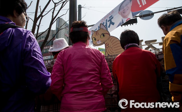(부천=포커스뉴스) 8일 오전 경기 부천시 역곡역 인근에서 열린 차명진 새누리당 부천소사구 후보 지원유세에서 유권자들이 유세를 경청하고 있다.