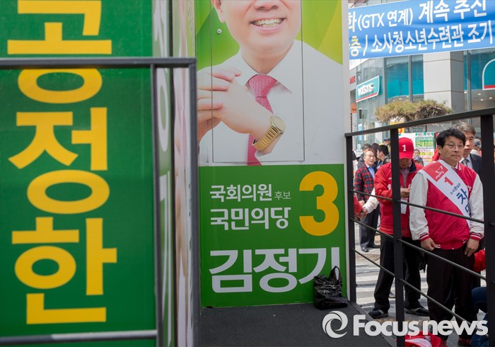 (부천=포커스뉴스) 8일 오전 경기 부천시 역곡역 인근에서 열린 차명진 새누리당 부천소사구 후보 지원유세에서 차 후보 유세차량 옆에 김정기 국민의당 후보 차량이 함께 주차돼 있다.