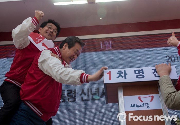 (부천=포커스뉴스) 8일 오전 경기 부천시 역곡역 인근에서 차명진 새누리당 부천소사구 후보 지원유세에서 나선 김무성 대표가 차 후보를 업어주고 있다.