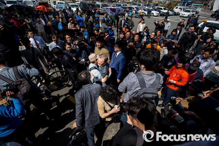(광주=포커스뉴스) 문재인 더불어민주당 전 대표가 8일 오후 전남 광주공원을 방문해 한 지지자와 포옹하고 있다.