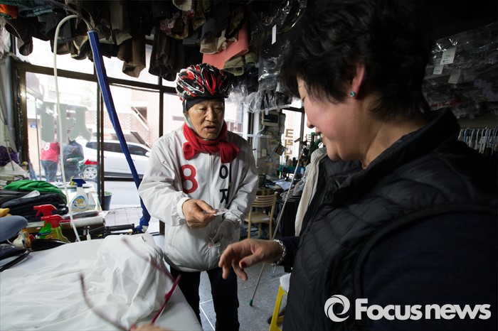 (서울=포커스뉴스) 이재오 무소속 은평을 후보가 8일 오후 서울 은평구 갈현동 일대에서 골목 유세를 하고 있다.