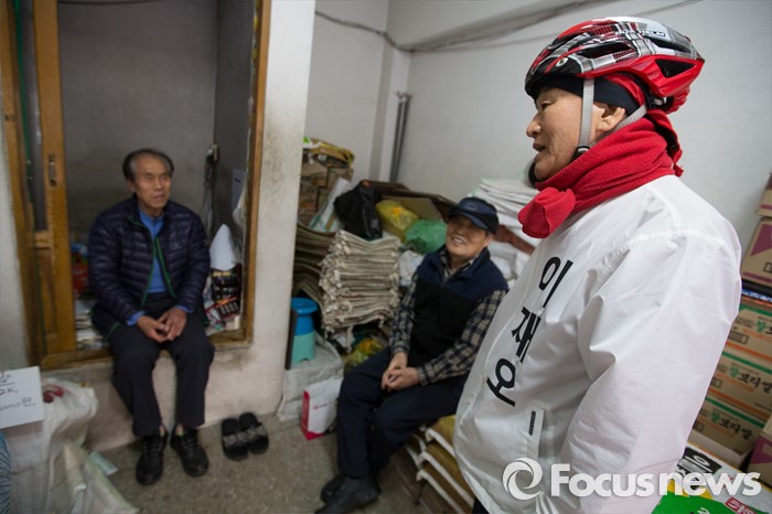 (서울=포커스뉴스) 이재오 무소속 은평을 후보가 8일 오후 서울 은평구 갈현동 일대에서 골목 유세를 하며 상인들과 이야기 나누고 있다.