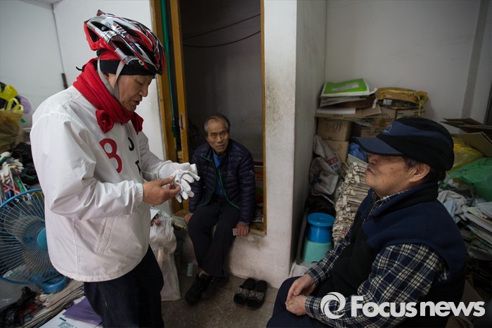 (서울=포커스뉴스) 이재오 무소속 은평을 후보가 8일 오후 서울 은평구 갈현동 일대에서 골목 유세를 하며 상인들과 이야기 나누고 있다.