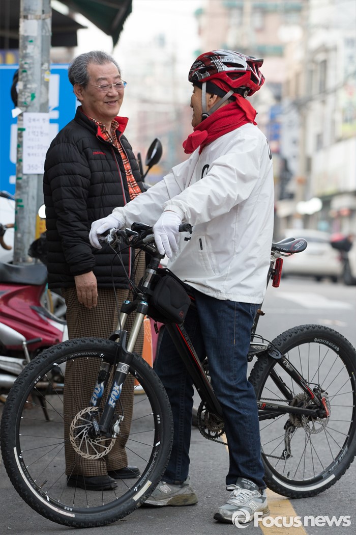 | △ 자전거타고 골목 이곳저곳 누비는 이재오 |