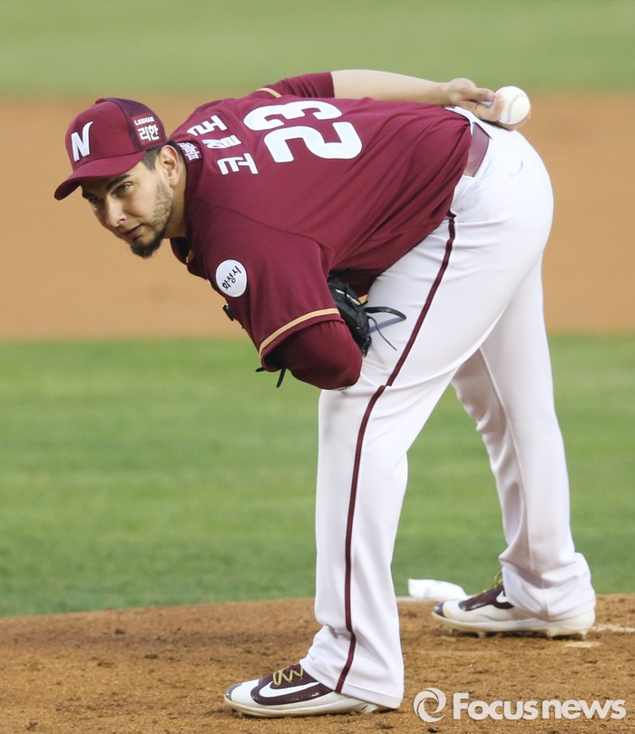 (서울=포커스뉴스) 8일 서울 잠실구장에서 열린 2016 프로야구 넥센-두산 경기에서 1회말 넥센 선발투수 코엘로가 허리를 깊숙히 숙인 독특한 자세로 포수의 사인을 읽고 있다.
