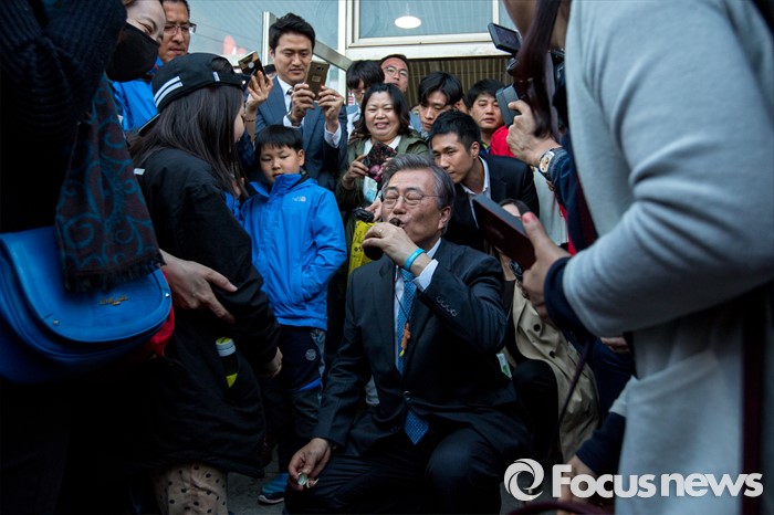 퐁광주=포커스뉴스) 문재인 더불어민주당 전 대표가 8일 오후 광주광역시 광산구 월곡시장을 방문해 한 어린이가 건낸 비타민 음료를 마시고 있다.