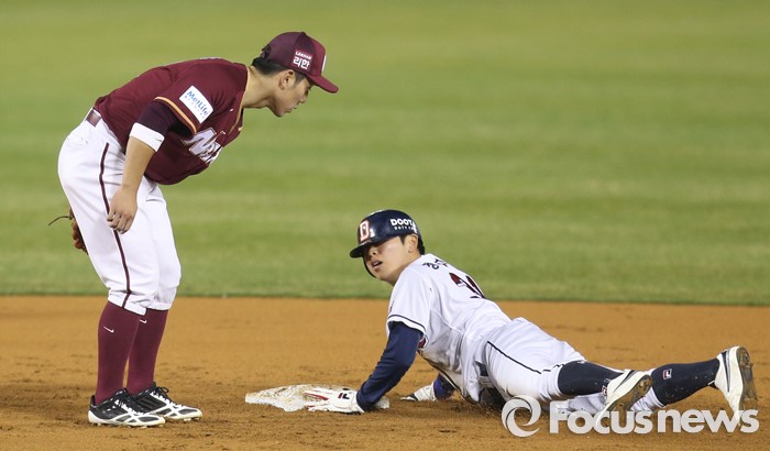 (서울=포커스뉴스) 8일 서울 잠실구장에서 열린 2016 프로야구 넥센-두산 경기 3회말 1사후 볼넷으로 진루한 두산 정수빈이 민병헌 타석때 2루 도루에 성공하고 있다. 왼쪽은 넥센 2루수 서건창.