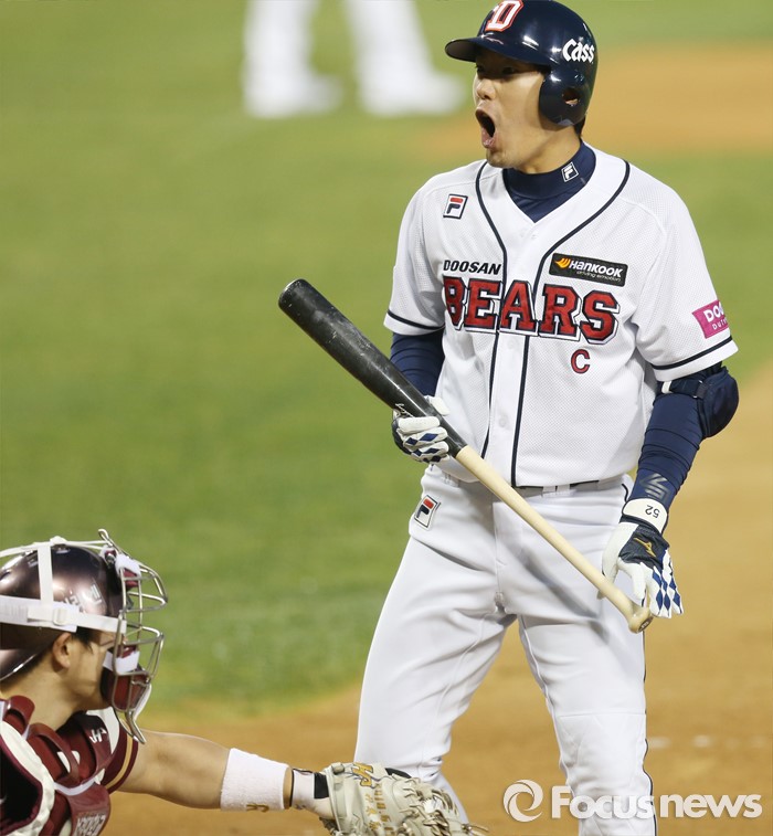 (서울=포커스뉴스) 8일 서울 잠실구장에서 열린 2016 프로야구 넥센-두산 경기 2회말 2사후 두산 김재호가 스트라이크 판정으로 삼진 아웃되자 주심을 바라보며 아쉬움을 표하고 있다.